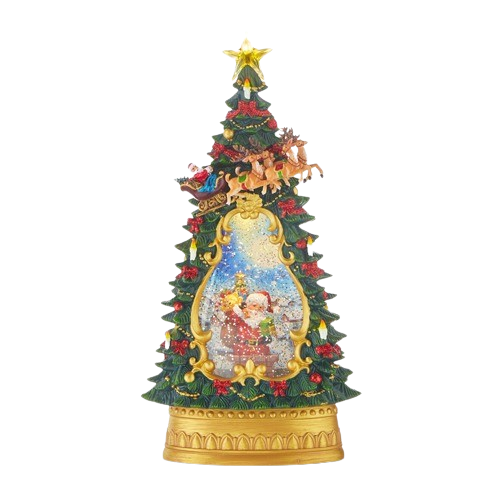 Introducing the "Down We Go" Lighted Snow Globe Collection, this exquisite snow globe showcases a Christmas tree featuring Santa Claus & his sleigh, creating a magical & festive scene.
